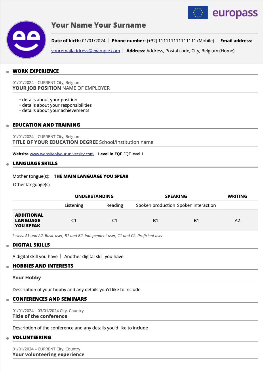 Entre as ferramentas disponíveis, está o currículo Europass: um modelo de currículo padronizado, muito usado na União Europeia, que permite mostrar suas competências, experiência profissional, educação e outras qualidades.
