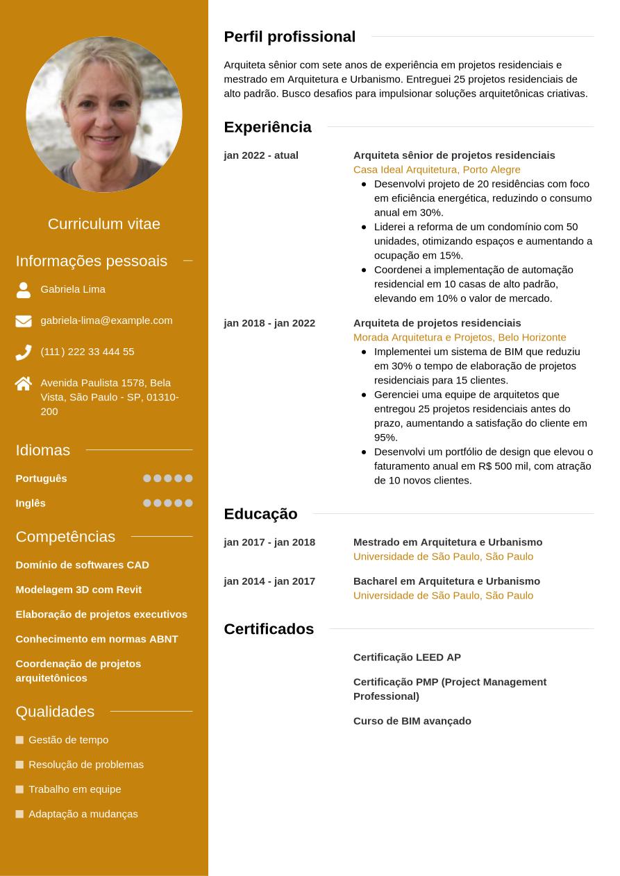 O resumo profissional ideal reúne as habilidades mais valorizadas para o cargo e ressalta as qualidades que diferenciam um arquiteto. Além disso, o currículo precisa sustentar as informações citadas nessa parte. Este exemplo de resumo profissional ilustra bem as características que discutimos até aqui: