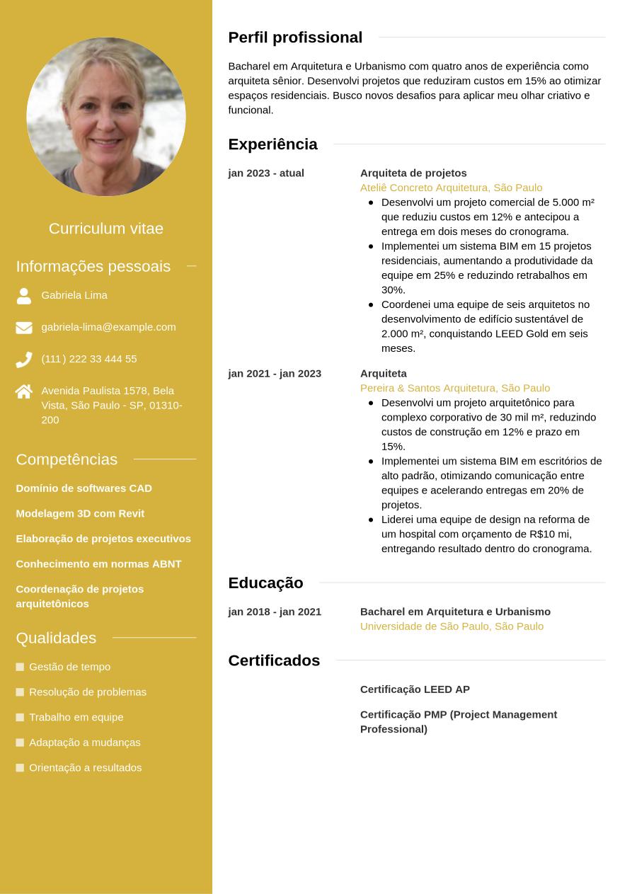 Um currículo de arquiteto tem como seções obrigatórias os detalhes pessoais, resumo profissional, experiência profissional, formação e habilidades.
