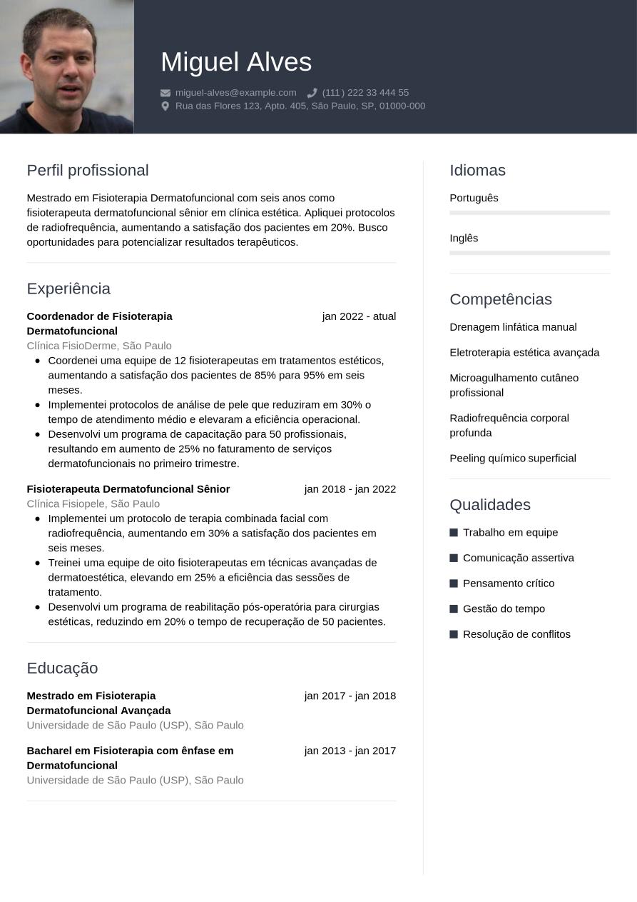 Com alguns anos de experiência, seu currículo de fisioterapeuta dermatofuncional precisa mostrar tanto sua formação quanto suas conquistas no trabalho. Inicie com um resumo profissional breve que ressalte suas habilidades e objetivos. Na parte de "Experiência Profissional", apresente seus cargos anteriores do mais recente ao mais antigo, informando empresa, cargo, datas e as principais funções e resultados alcançados. Adicione uma seção de competências que contemple suas habilidades técnicas (como softwares e idiomas) e interpessoais (liderança, negociação, gestão de projetos).