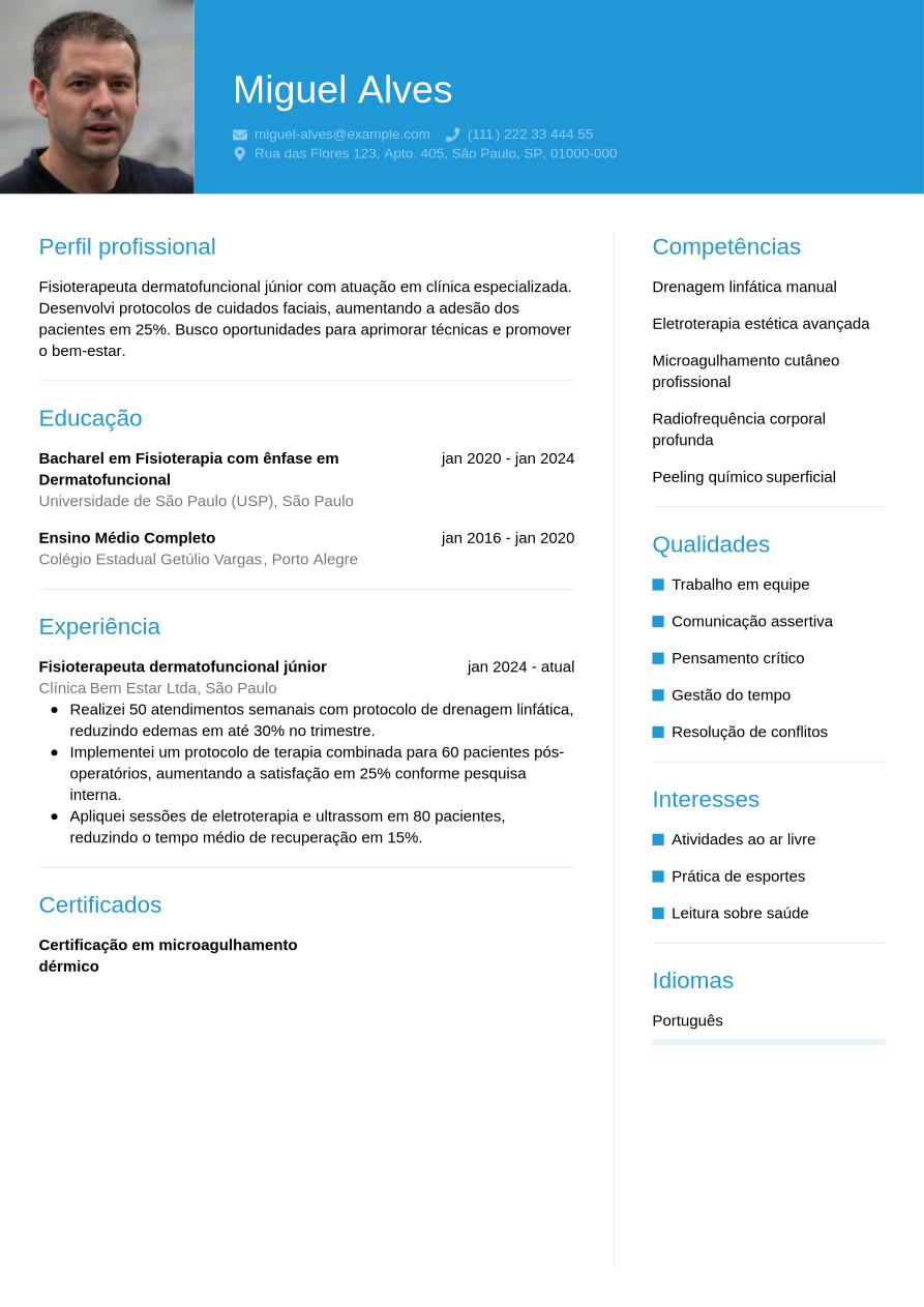 Agora que já exploramos todas as seções obrigatórias e opcionais de um currículo de fisioterapeuta dermatofuncional, lembre-se: o mais importante é personalizar o documento conforme a vaga desejada. Com um bom currículo em mãos, você já deu um passo importante rumo à contratação. A seguir, veja um exemplo de currículo para fisioterapeuta dermatofuncional.