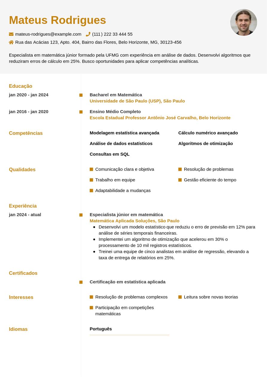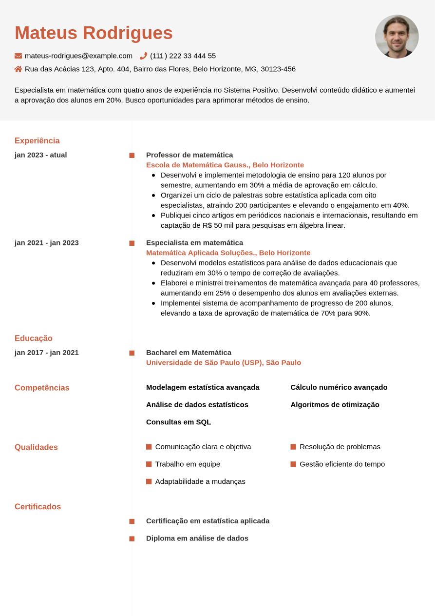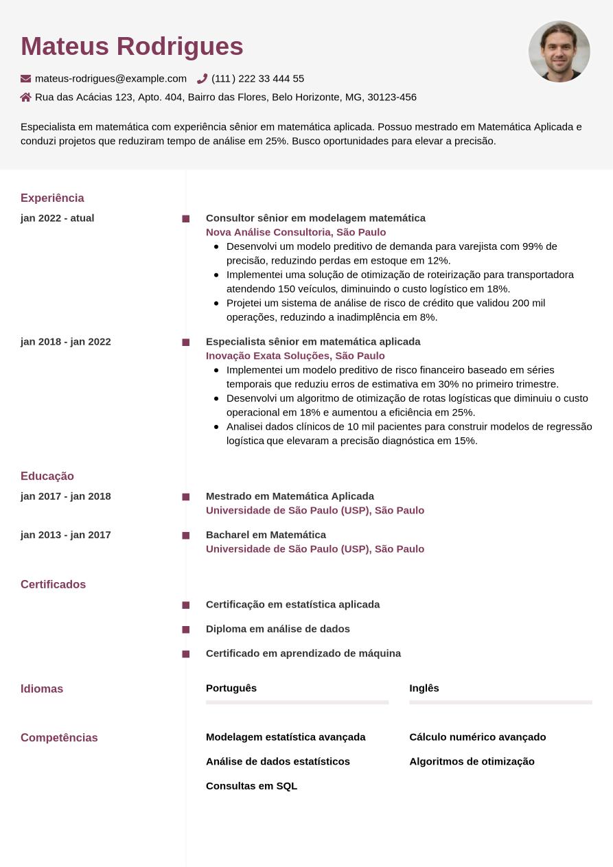 Agora que já exploramos todas as seções obrigatórias e opcionais de um currículo de matemática, lembre-se: o mais importante é personalizar o documento conforme a vaga desejada. Ter um currículo de qualidade faz toda a diferença no processo seletivo. Confira abaixo um exemplo pensado para especialista em matemática.