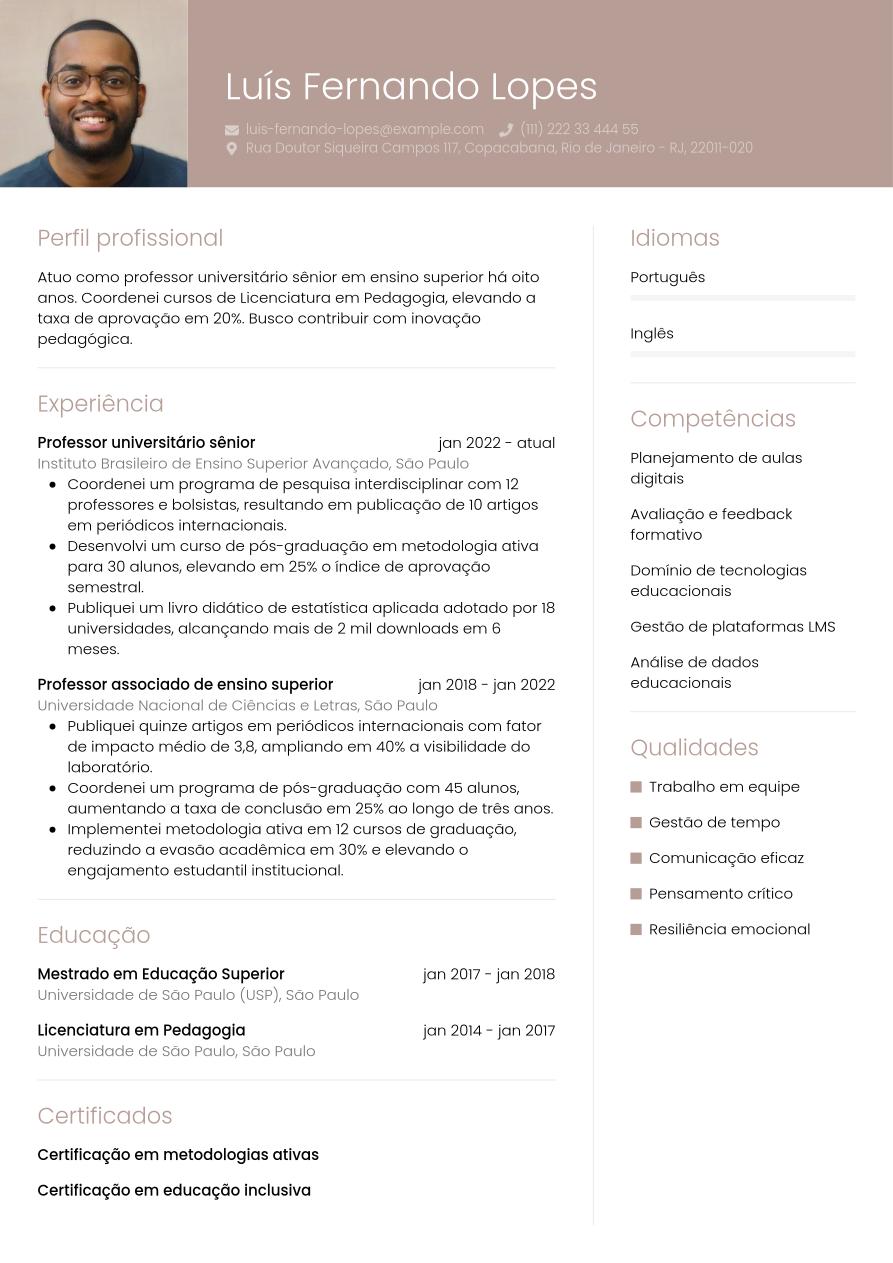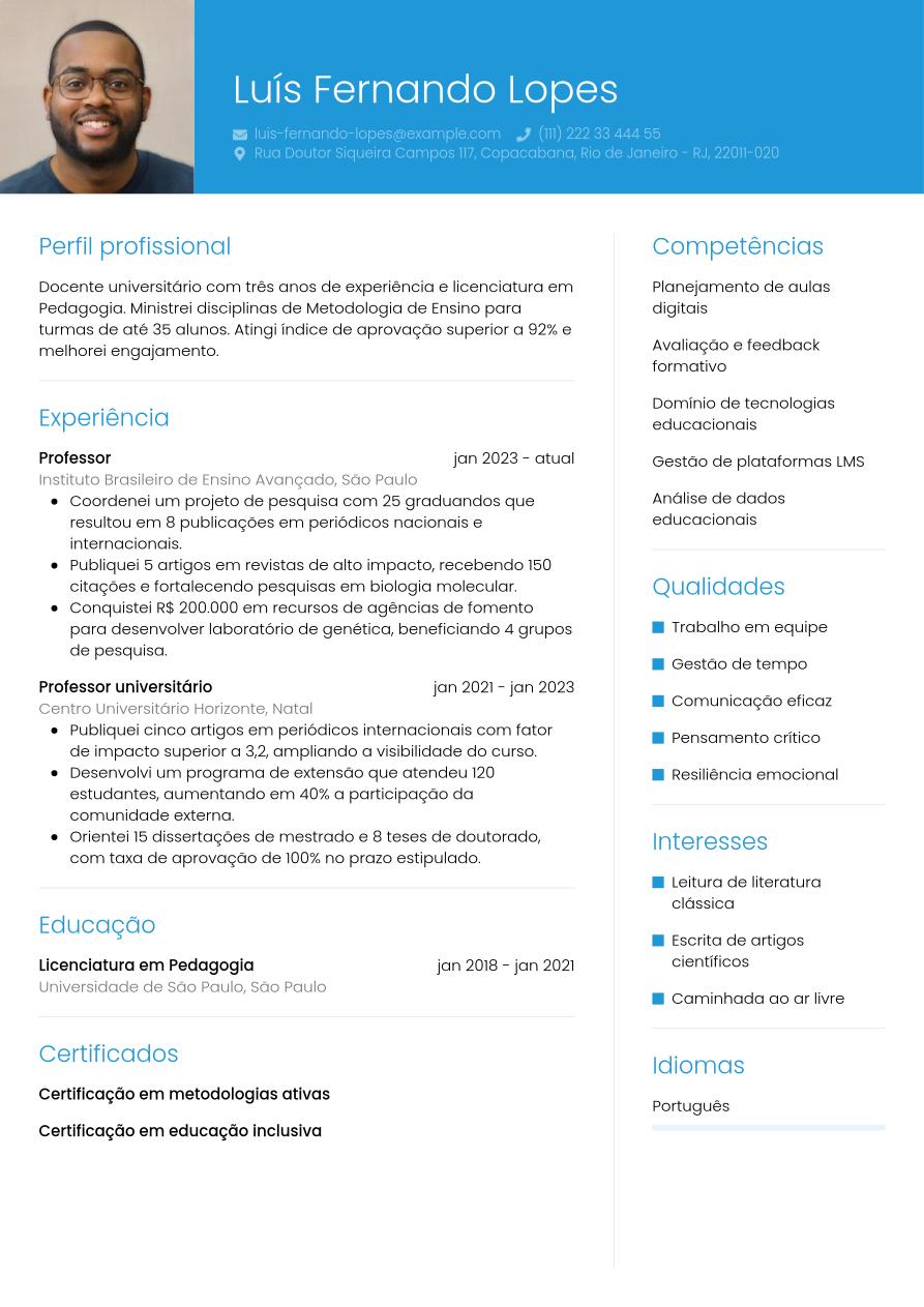 Para um um professor experiente, o currículo precisa resumir de forma estratégica suas conquistas e capacidade de liderança. Comece com um resumo claro e objetivo, em parágrafo ou lista, destacando sua área de atuação, anos de experiência e principais contribuições para o sucesso das organizações. Na seção de Experiência Profissional, foque nas posições mais recentes e relevantes, geralmente dos últimos 10-15 anos. Descreva seu papel estratégico, responsabilidades de liderança e, sobretudo, os resultados e impactos gerados. Sempre que possível, utilize dados e métricas para quantificar suas conquistas.
